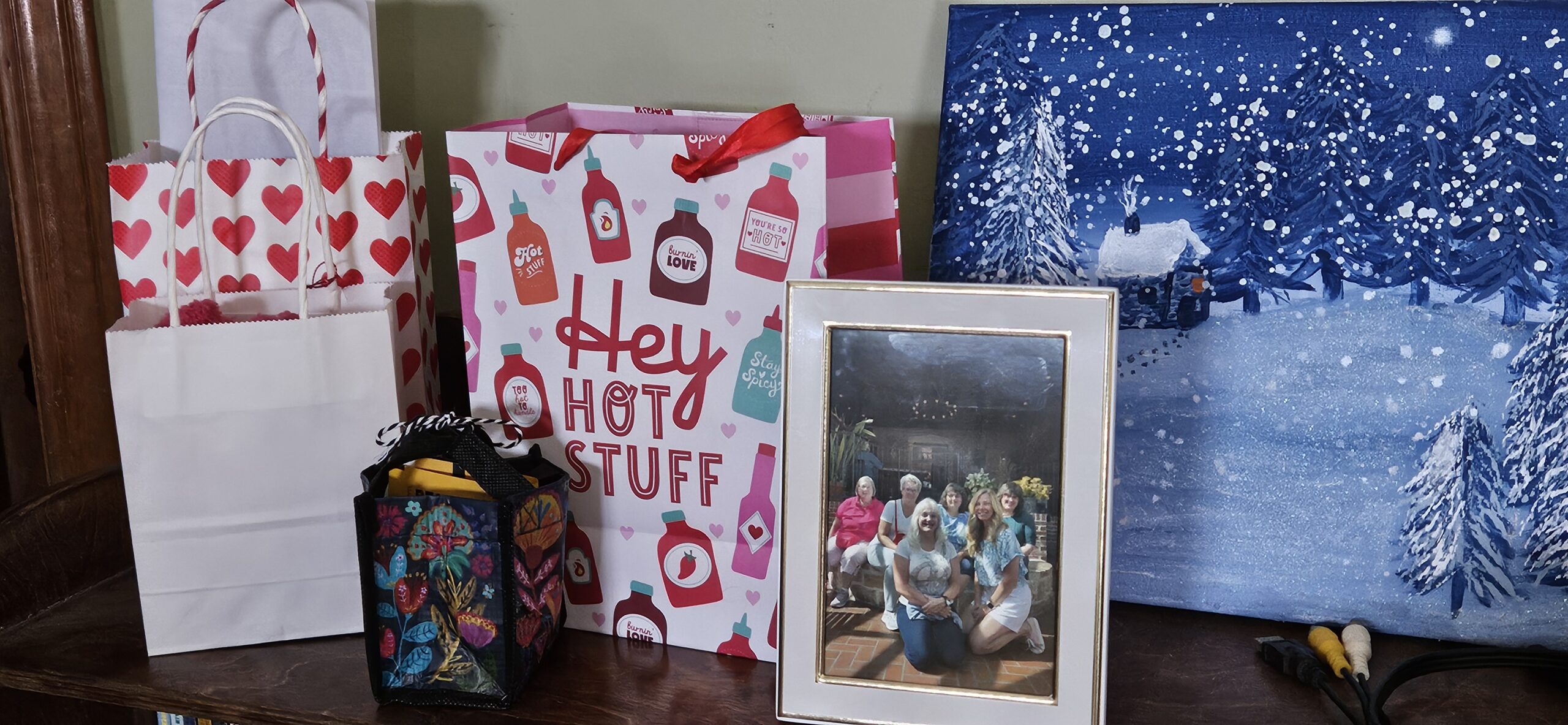 Chocolates (Of course!) and some photos, one of which I framed. Then, I wrapped the framed photo in some Valentine’s Day tissue paper before putting them in the cloth bags.