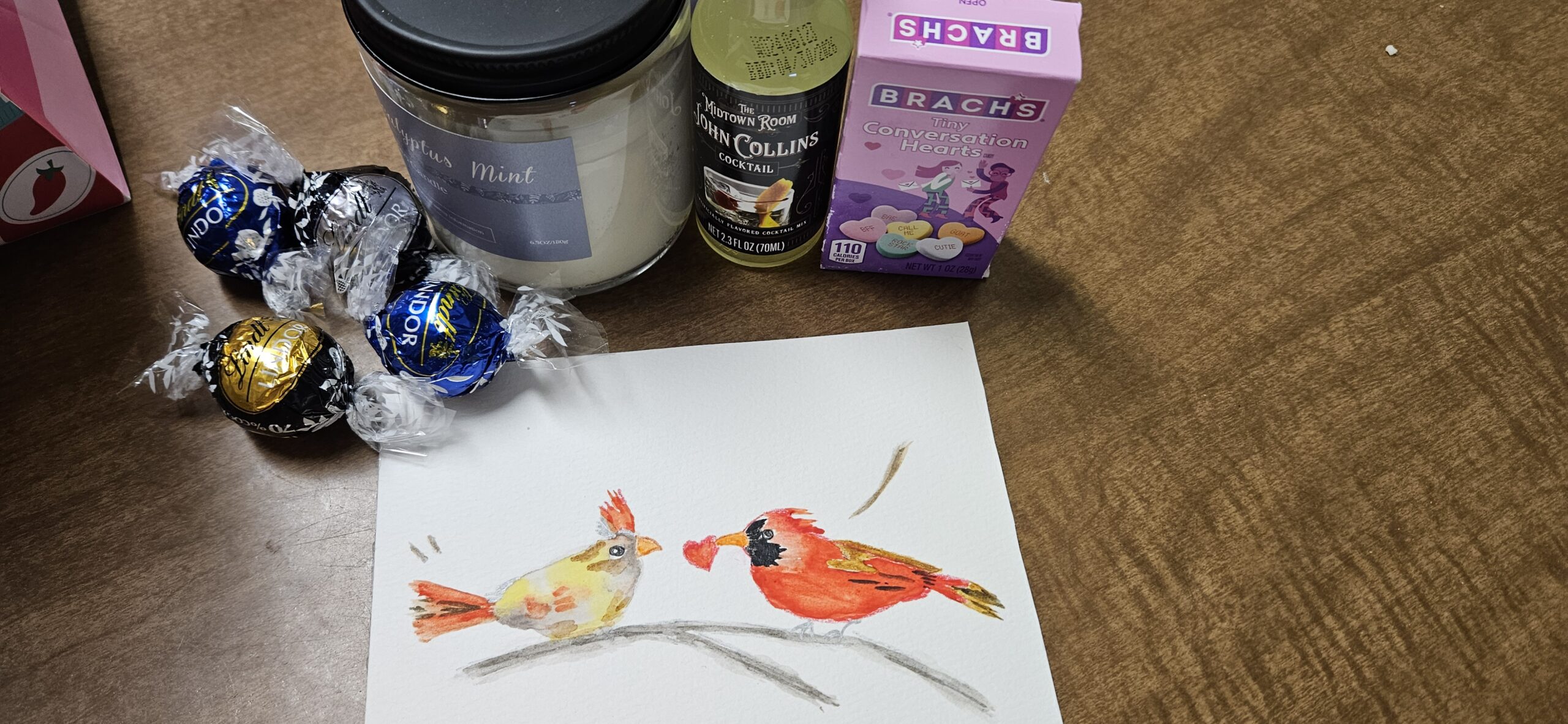 The other friends went a self-care route, we know each other well after almost 25 years! And some of us are very talented on top of that, look at the beautiful cardinal print my friend made for me.